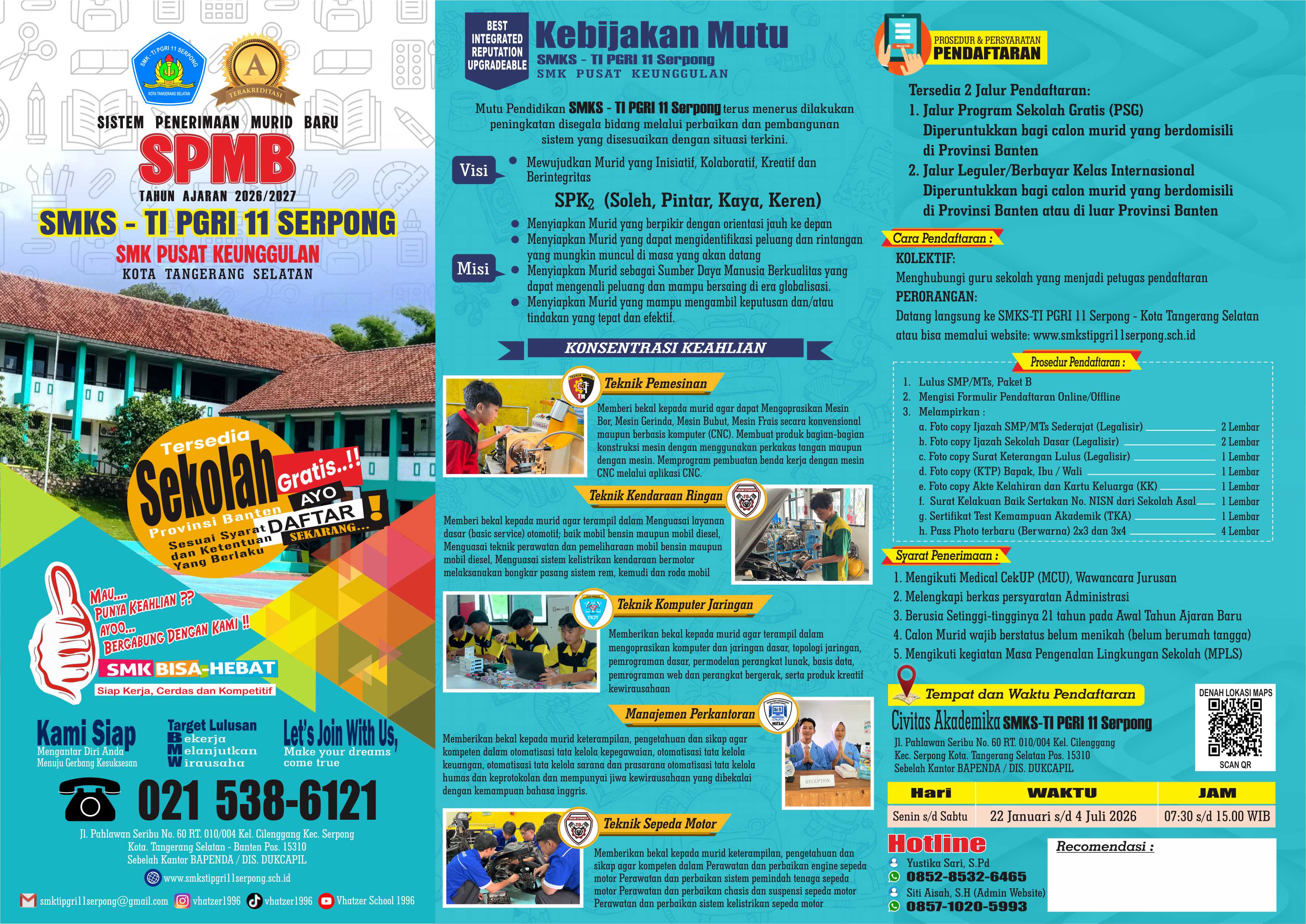 Sistem Penerimaan Murid Baru SMKS TI PGRI 11 Serpong Tahun Ajaran 2026/2027 akan dilaksanakan dalam satu tahap. Pastikan untuk mempersiapkan persyaratan dan mengikuti jadwal pendaftaran yang tersedia di situs resmi sekolah.